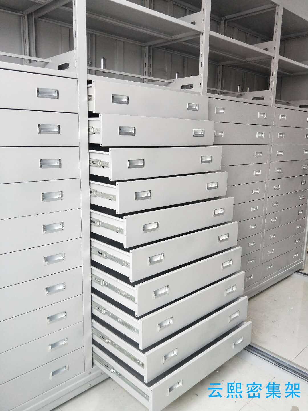 底圖密集柜源于檔案密集柜的原理基礎上對圖紙存放裝具的一種開發;實現了對圖紙的保密封存、集中管理、防火、防潮、防鼠、防盜的保障。這種產品采用設有特別導軌的滾輪式結構抽屜式結構,實現對圖紙的平整存放,不會對圖紙造成損壞。按圖紙的標準一般只對0號底圖與1號底圖進行抽屜式結構制作,即一般分為0號底圖柜與1號底圖柜。